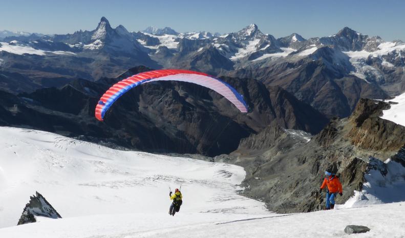 Die Hike & Fly Tour vom 16. Oktober auf's Allalinhorn war nicht ein Wunschbild, nicht ein Märchen, nicht eine Fantasie, nicht eine Sinnestäuschung; nein es war die absolute Realität und ein wirklicher Traum zugleich. Die 15 aufgestellten und doch vor Freude leicht nervösen Piloten erlebten eine Hike & Fly Tour wie man sie sich besser nicht hätte wünschen können. Früh morgens bei klarer Nacht und Sternenhimmel begann das Abenteuer in Fieschertal. Bei der Fahrt nach Saas Fee wurde es immer heller, bis wir am Landeplatz in Saas Grund das majestätische Allalinhorn im Sonnenschein bewunderten und wussten, dort hinauf wollen wir. Nach der Bahnfahrt auf das Mittelallalin legten wir noch eine kurze Kaffepause ein und bewunderten die prächtige Aussicht, bevor wir uns dann auf den Weg zum Gipfel machten. Der abwechslungsreiche Aufstieg über den Gletscher, zwischen Spalten und Schneefelder war ein Genuss. Die zwei Bergführer Simon und Dominik führten uns in einem 2 1/2 stündigen Aufstieg sicher auf den Gipfel, wo wir eine Aussicht, mit einer wahnsinnigen Fernsicht erlebten, die unsere Herzen höher schlagen liess. Nach einer kurzen Pause mit Verpflgung stiegen wir ca. 50 Höhenmeter vom Gipfel ab, wo sich unser Startplatz befand. Der Wind war perfekt und der Start problemlos. Ein 30 minütiger Panoramaflug über Gletscher, Berge, Täler und farbige Bergwiesen war so überwältigend, dass man vor Glück leer schlucken musste. Nach der Landung stand allen ein Strahlen im Gesicht und man gratulierte und umarmte sich.
