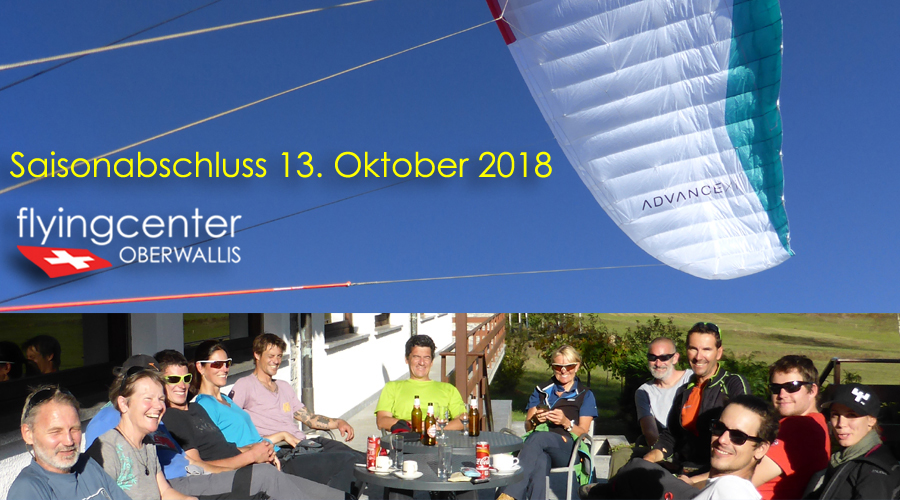 Saisonabschluss heisst aber nicht, dass wir nicht mehr fliegen. Bis 26. Oktober haben wir noch Höhenflugschulung. Vom 27. Oktober bis 3. November fliegen wir zu unserer letzten Flugferienreise nach Andalusien . Danach gibts nochmals Höhenflugschulung bis 16. November 2018. Anschliessend hat das Flyingcenter Oberwallis Betriebsferien bis 7. Dezember 2018.